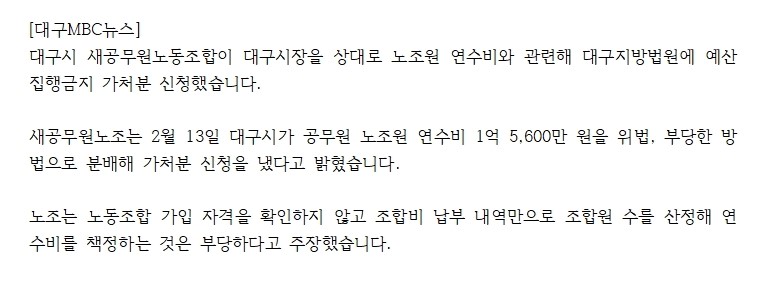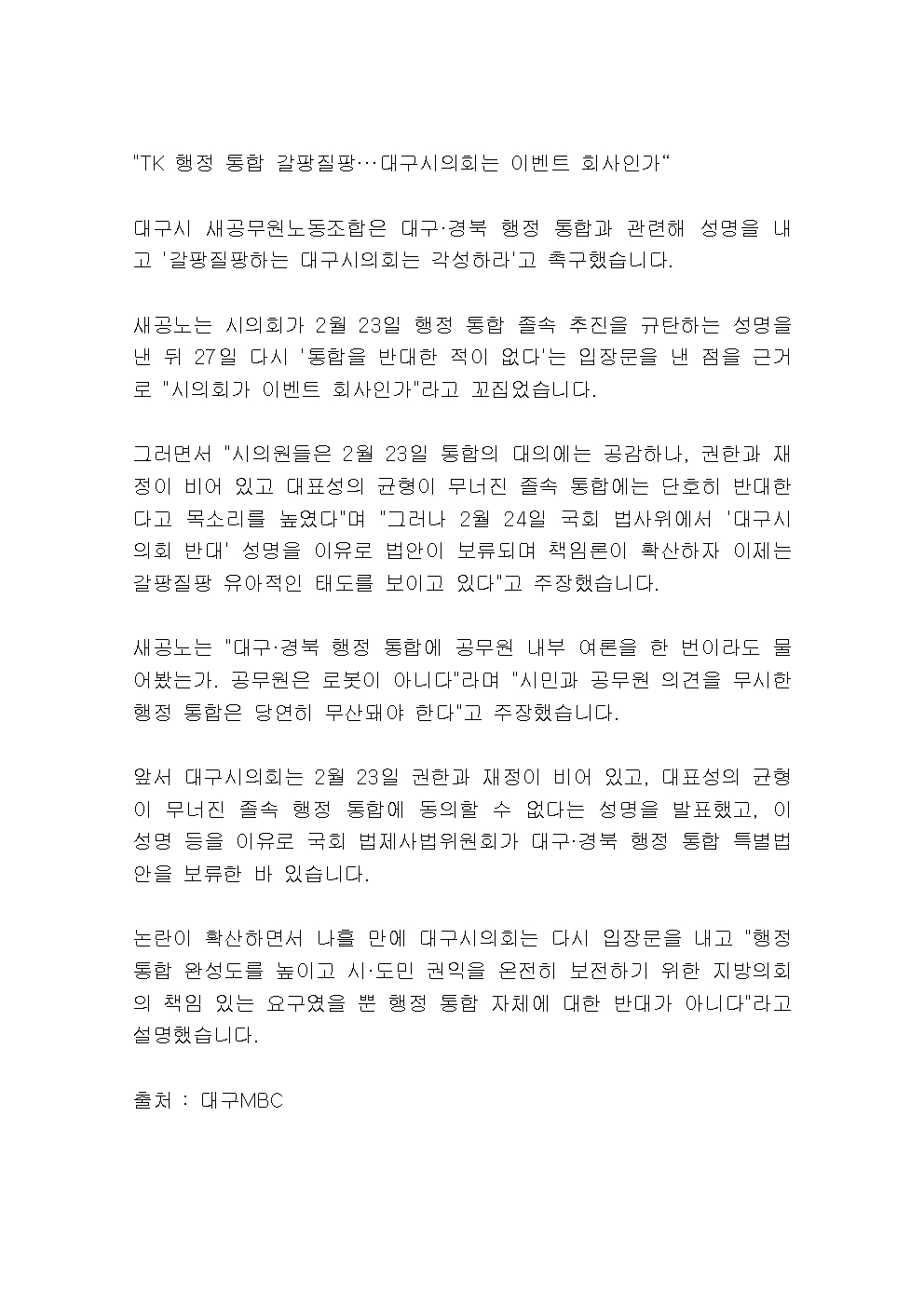 대구시 새공무원노동조합은 대구·경북 행정 통합과 관련해 성명을 내고 `갈팡질팡하는 대구시의회는 각성하라`고 촉구했습니다. 새공노는 시의회가 2월 23일 행정 통합 졸속 추진을 규탄하는 성명을 낸 뒤 27일 다시 `통합을 반대한 적이 없다`는 입장문을 낸 점을 근거로 "시의회가 이벤트 회사인가"라고 꼬집었습니다. 그러면서 "시의원들은 2월 23일 통합의 대의에는 공감하나, 권한과 재정이 비어 있고 대표성의 균형이 무너진 졸속 통합에는 단호히 반대한다고 목소리를 높였다"며 "그러나 2월 24일 국회 법사위에서 `대구시의회 반대` 성명을 이유로 법안이 보류되며 책임론이 확산하자 이제는 갈팡질팡 유아적인 태도를 보이고 있다"고 주장했습니다. 새공노는 "대구·경북 행정 통합에 공무원 내부 여론을 한 번이라도 물어봤는가. 공무원은 로봇이 아니다"라며 "시민과 공무원 의견을 무시한 행정 통합은 당연히 무산돼야 한다"고 주장했습니다. 앞서 대구시의회는 2월 23일 권한과 재정이 비어 있고, 대표성의 균형이 무너진 졸속 행정 통합에 동의할 수 없다는 성명을 발표했고, 이 성명 등을 이유로 국회 법제사법위원회가 대구·경북 행정 통합 특별법안을 보류한 바 있습니다. 논란이 확산하면서 나흘 만에 대구시의회는 다시 입장문을 내고 "행정 통합 완성도를 높이고 시·도민 권익을 온전히 보전하기 위한 지방의회의 책임 있는 요구였을 뿐 행정 통합 자체에 대한 반대가 아니다"라고 설명했습니다. 출처 : 대구MBC