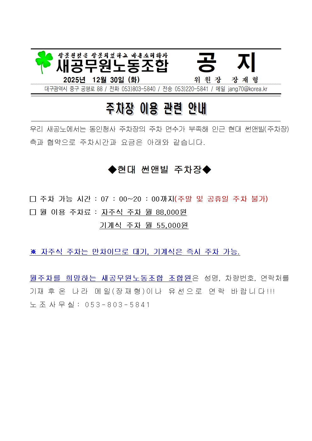 [새공노]현대 썬앤빌 주차장 이용 관련 안내